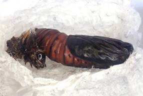 ←蛹(さなぎ) 前回繭(まゆ)を鋏(はさみ)で開いた開口部は、また糸を吐いて塞いだので、鋏で開きました。 成虫をまだ見たことがないので、ピートモスを買ってきてその中で越冬させます。 |