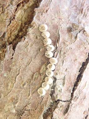 ←ミドリシジミの卵を探しに行ってきました 那珂市 今日のハンノキ林では3箇所から卵を見つけましたが3箇所とも殻(から)しか見つかりませんでした。 この殻は汚れていないので、今年孵化した卵のようです。 11個あります。1箇所でこんなにたくさん産んだのは初めて見ました。 |