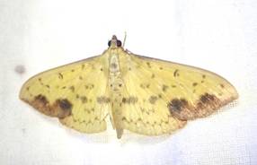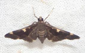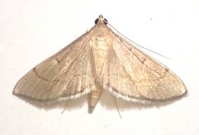 ←マエウスキノメイガ ツトガ科 成虫出現は7〜10月 幼虫食草はダイズ、インゲンマメなどマメ科作物の害虫です。 |