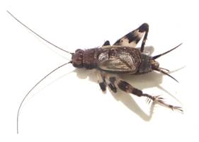 ←マダラスズ ヒバリモドキ科 成虫出現は6〜11月 体長4mmの小さなコオロギです。 |