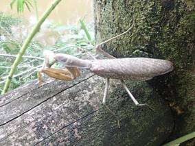 ←ハラビロカマキリ カマキリ科 ハラビロカマキリの茶色型は珍しいです。普通は緑色です。 前翅の中央付近の左右横側に白点があるのか特徴です。 |