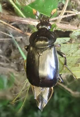 ←クロシデムシ シデムシ科 哺乳類、鳥、爬虫類などの死体を食べる森の掃除屋さんです。 死臭、腐敗臭がすごいのと、衛生的にも触れません。 カブトムシの小型ほどの大きさがあり、立派です。 飛んできて、後翅を出したまま、止っていました。 |