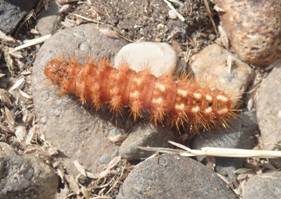 ←スジモンヒトリ幼虫 ヒトリガ科 偕楽園公園 蛹になる場所を求めてか、えっちらえっちら歩いていました。 |