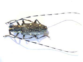 ←キボシカミキリ♂ カミキリムシ科 イチジクを食い荒らしたにっくき成虫を見つけて捕らえたので、お湯で殺して展足しました。 触角が長いので♂です。 |