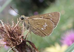 ←オオチャバネセセリ セセリチョウ科 急な寒さで動けないようです。 アザミの枯れた花にいました。 |