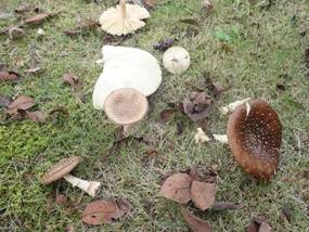 ←テングタケ 千波湖公園 芝生広場 数人が集まって騒いでいます。そこに手のひらより大きなキノコが数本出ています。 「食べれるんですか」 と聞いたらだれも知らないという。 帰宅して図鑑で調べたら毒キノコでした。 |