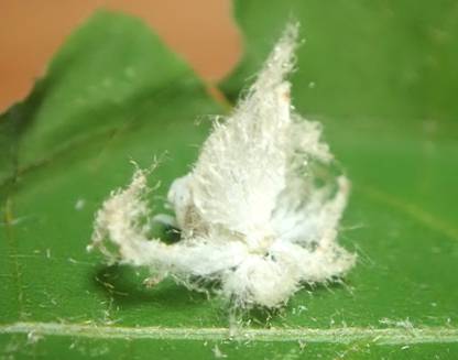 ←シラホシハゴロモの仲間の幼虫 水戸市偕楽園公園 クズの葉っぱの上で綿毛のような白い物がクルクルと回っています。 よく見るとこちらがお尻のようです。 |