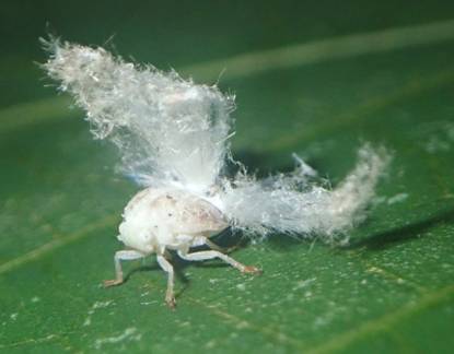 ←よく見ると顔も体もあります。 お尻の白いお飾りは蝋物質のようです。 クワキジラミの白い糸と同じようなものですネ。 成虫になった姿も見たいものです。 |
