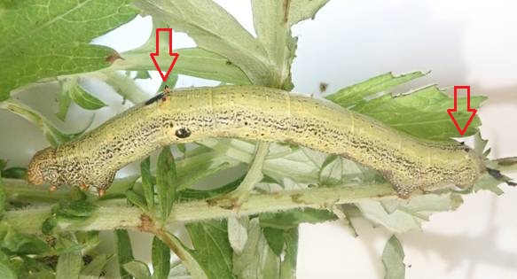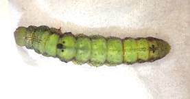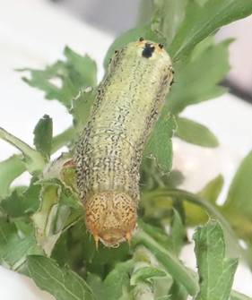 ↑終齢 体長60mm 第2腹節背部と尻部背中に1対の刺があります。 孵化17日目 |