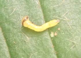 ←2齢になった? 体長4mmぐらい 孵化9日目 イヌシデには食いつかず、クマシデを齧っています。 |