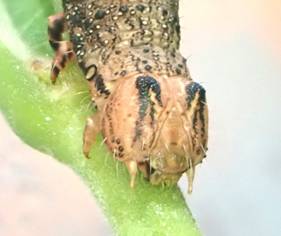 ←初齢 体長3mmぐらい 孵化4日目 下側に見えているのが食痕です。 表皮を削りとって齧(かじ)っています。 |
