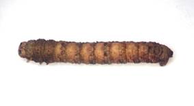 ←前蛹(ぜんよう) 体長 32mm(実測値)に縮んだ 孵化29日目 下痢便をして歩き回っているので、チップを入れた飼育ケースに移動したら潜っていきました。 |