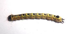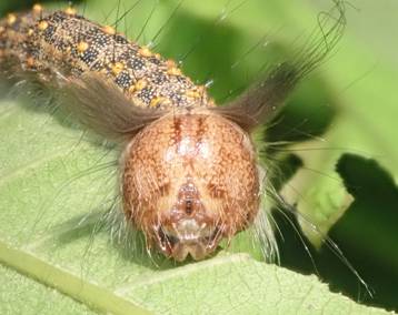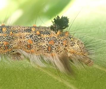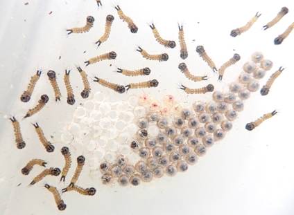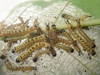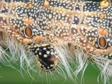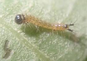 ←2齢 孵化5日目 体長4mmぐらい まだ集団でいます。 背中に点が現れた2齢と初齢が混じっています。 硬い葉っぱを気にせず齧っています。 |