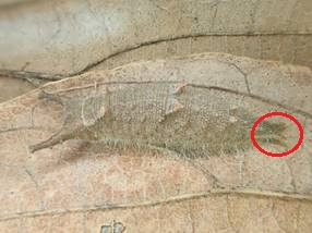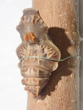 ←ジャコウアゲハ アゲハチョウ科 常陸太田市久米町 毎年、電柱にくっ付いてサナギになっているので、見に行ってみました。 この付近には幼虫食草のウマノスズクサがたくさん生えています。 幼虫は、木の幹、コンクリー杭、看板の脚や電柱など硬い物にくっついてナナギになります。 1匹だけ持ち帰り、木の棒に木工ボンドであった様に貼り付けました。 胸を縛り付けていた糸は切ってしまったので、裁縫用の糸を使いました。 |